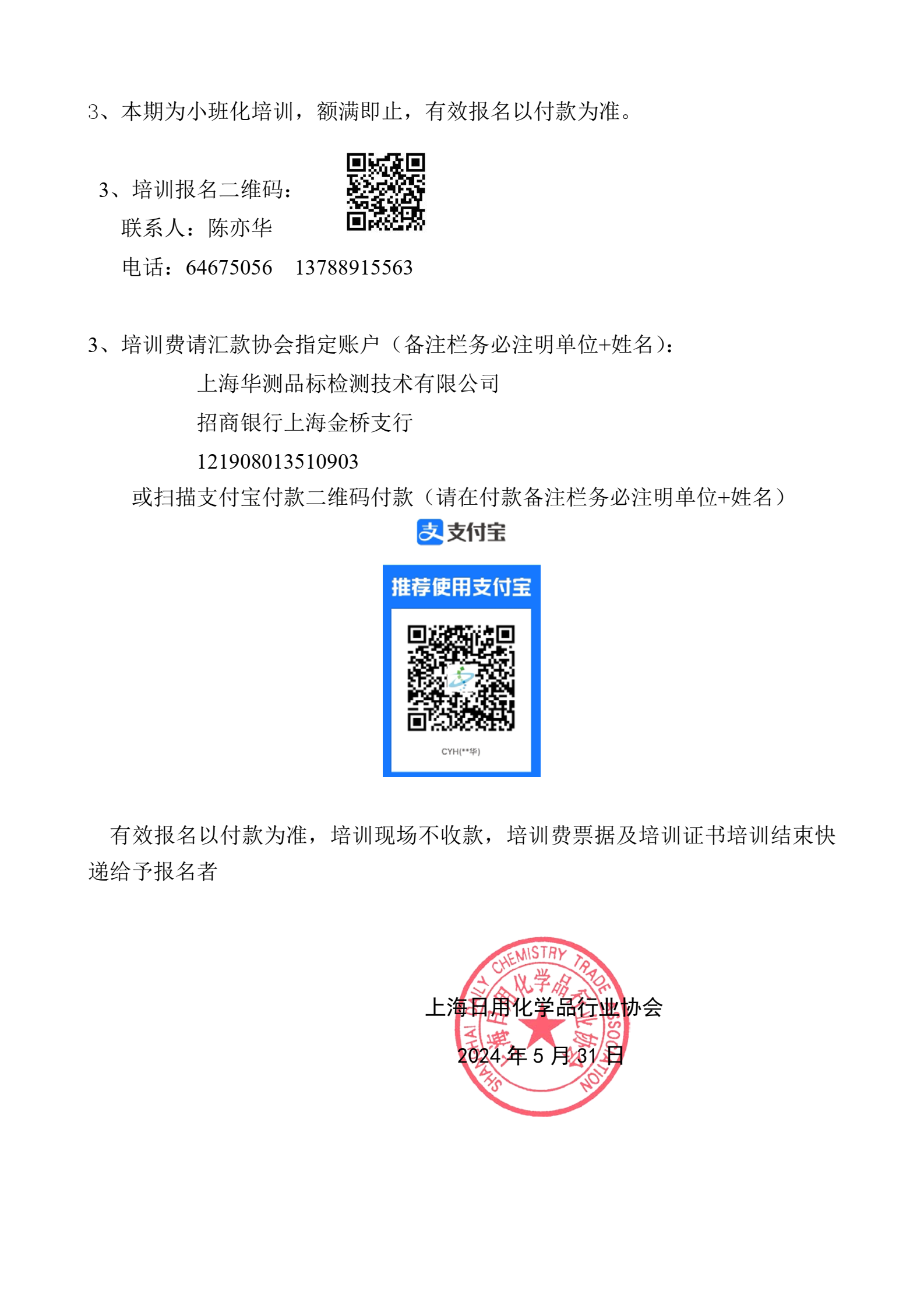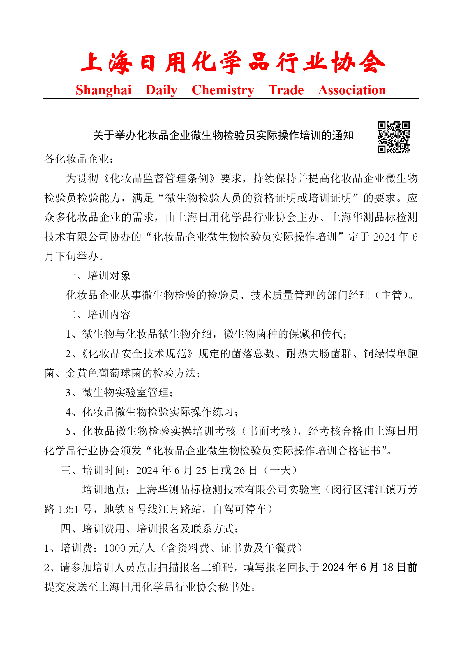 为贯彻《化妆品监督管理条例》要求,持续保持并提高化妆品企业微生物检验员检验能力,满足“微生物检验人员的资格证明或培训证明”的要求。应众多化妆品企业的需求,由上海日用化学品行业协会主办、上海华测品标检测技术有限公司协办的“化妆品企业微生物检验员实际操作培训”定于2024年6月下旬举办。报名详见培训通知。